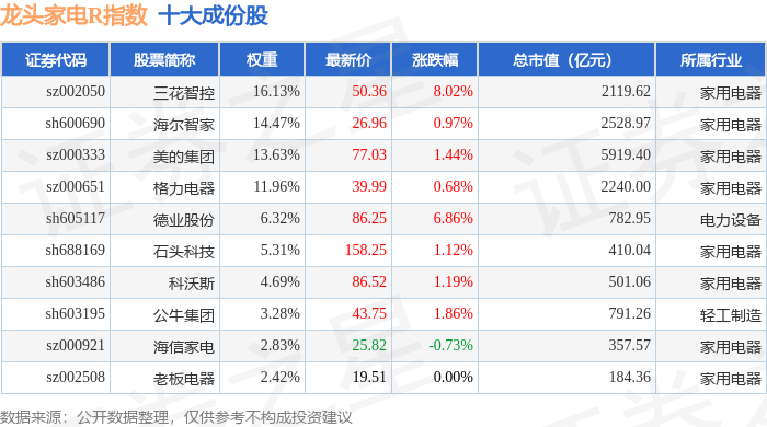 证券之星消息,11月6日,龙头家电R(480028)指数报收于20305.24点,涨2.59%,成交282.58亿元,换手率1.9%。当日该指数成份股中,上涨的有19家,汉宇集团以17.4%的涨幅领涨,下跌的有9家,澳柯玛以1.64%的跌幅领跌。