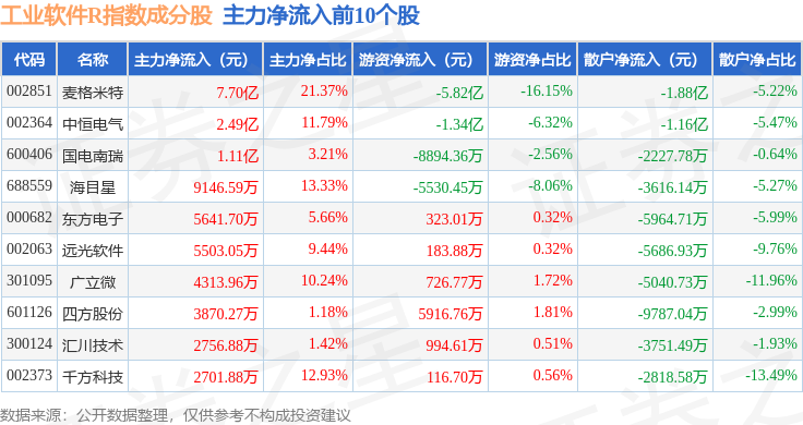 资金流向方面,工业软件R(480034)指数成份股当日主力资金净流入合计8.73亿元,游资资金净流出合计6.33亿元,散户资金净流出合计2.4亿元。成份股资金流向详情见下表: