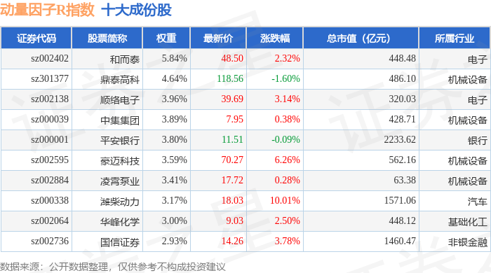 证券之星消息,11月6日,动量因子R(480057)指数报收于2868.63点,涨2.33%,成交448.9亿元,换手率1.86%。当日该指数成份股中,上涨的有41家,潍柴动力以10.01%的涨幅领涨,下跌的有9家,嘉益股份以1.72%的跌幅领跌。