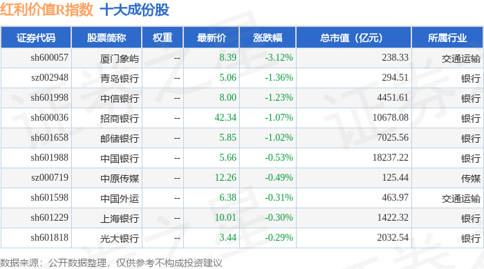 资金流向方面,红利价值R(489016)指数成份股当日主力资金净流出合计2.99亿元,游资资金净流出合计2.4亿元,散户资金净流入合计5.4亿元。成份股资金流向详情见下表:
