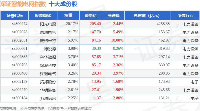 证券之星消息,11月6日,深证智能电网(970054)指数报收于4209.09点,涨2.86%,成交636.38亿元,换手率6.24%。当日该指数成份股中,上涨的有34家,科士达以10.0%的涨幅领涨,下跌的有15家,华自科技以2.52%的跌幅领跌。