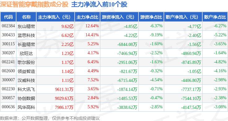 资金流向方面,深证智能穿戴(970074)指数成份股当日主力资金净流入合计19.72亿元,游资资金净流出合计11.8亿元,散户资金净流出合计7.93亿元。成份股资金流向详情见下表: