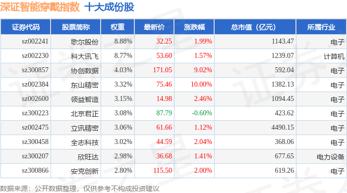 深证智能穿戴(970074)指数十大成份股详情如下: