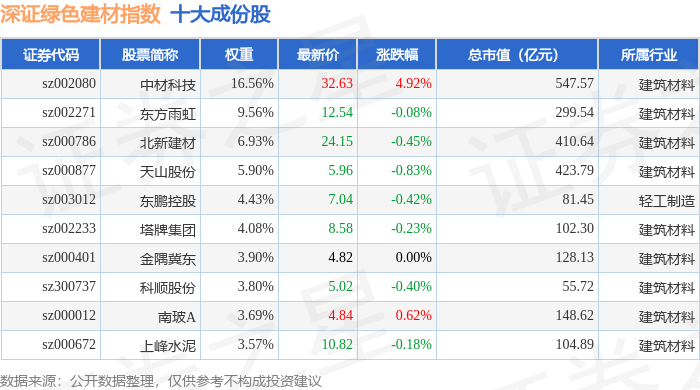 证券之星消息,11月6日,深证绿色建材(970077)指数报收于1345.85点,涨0.17%,成交59.51亿元,换手率1.72%。当日该指数成份股中,上涨的有8家,中材科技以4.92%的涨幅领涨,下跌的有19家,玉马科技以9.38%的跌幅领跌。