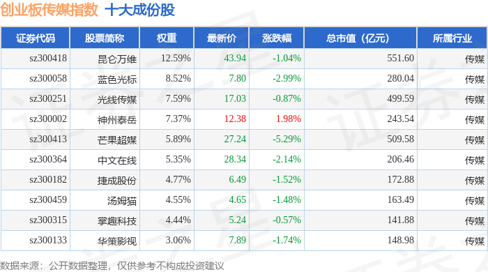 证券之星消息,11月6日,创业板传媒(970084)指数报收于1340.78点,跌1.58%,成交200.14亿元,换手率5.04%。当日该指数成份股中,上涨的有2家,神州泰岳以1.98%的涨幅领涨,下跌的有39家,幸福蓝海以9.35%的跌幅领跌。