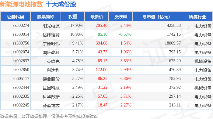 证券之星消息,11月6日,新能源电池(980027)指数报收于3635.46点,涨1.75%,成交799.17亿元,换手率3.67%。当日该指数成份股中,上涨的有37家,科士达以10.0%的涨幅领涨,下跌的有13家,华自科技以2.52%的跌幅领跌。