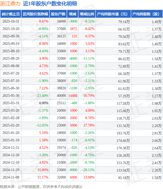 从股价来看,2025年10月20日至2025年10月31日,浙江鼎力区间涨幅为8.67%,在此期间股东户数减少3000.0户,减幅为8.11%。