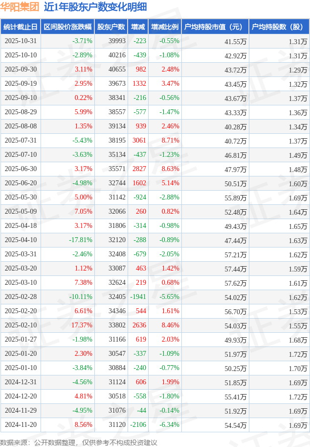从股价来看,2025年10月10日至2025年10月31日,华阳集团区间跌幅为3.71%,在此期间股东户数减少223.0户,减幅为0.55%。
