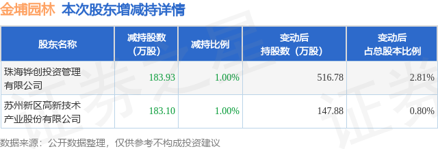 证券之星消息,11月6日金埔园林发布公告《金埔园林:关于股东减持计划实施完毕的公告》,其股东珠海铧创投资管理有限公司、苏州新区高新技术产业股份有限公司于2025年10月14日至2025年11月5日间合计减持367.03万股,占公司目前总股本的1.9954%,变动期间该股股价上涨4.87%,截止11月5日收盘报9.48元。