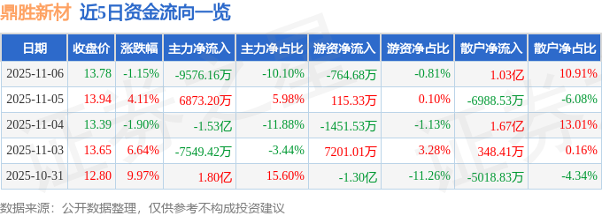 证券之星消息,截至2025年11月6日收盘,鼎胜新材(603876)报收于13.78元,下跌1.15%,换手率7.32%,成交量68.05万手,成交额9.48亿元。