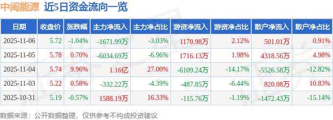 证券之星消息,截至2025年11月6日收盘,中闽能源(600163)报收于5.72元,下跌1.04%,换手率5.05%,成交量96.07万手,成交额5.52亿元。