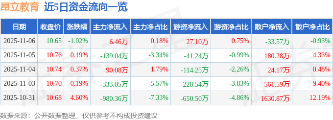 证券之星消息,截至2025年11月6日收盘,昂立教育(600661)报收于10.65元,下跌1.02%,换手率1.18%,成交量3.38万手,成交额3600.22万元。
