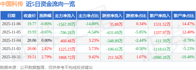 证券之星消息,截至2025年11月6日收盘,中国科传(601858)报收于19.77元,下跌0.8%,换手率0.68%,成交量5.35万手,成交额1.06亿元。
