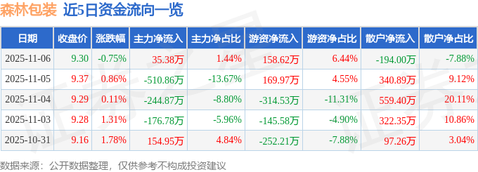 证券之星消息,截至2025年11月6日收盘,森林包装(605500)报收于9.3元,下跌0.75%,换手率0.64%,成交量2.65万手,成交额2461.84万元。