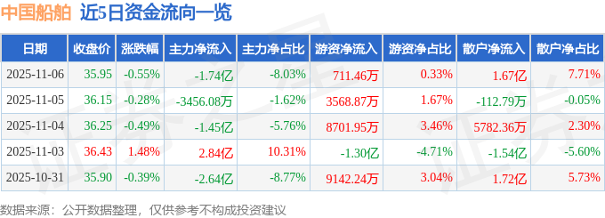证券之星消息,截至2025年11月6日收盘,中国船舶(600150)报收于35.95元,下跌0.55%,换手率0.8%,成交量60.23万手,成交额21.69亿元。