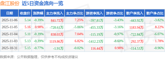 证券之星消息,截至2025年11月6日收盘,盘江股份(600395)报收于5.14元,下跌0.39%,换手率1.05%,成交量22.52万手,成交额1.16亿元。