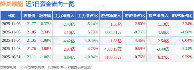 证券之星消息,截至2025年11月6日收盘,隆基绿能(601012)报收于21.77元,下跌0.37%,换手率2.92%,成交量221.65万手,成交额48.19亿元。