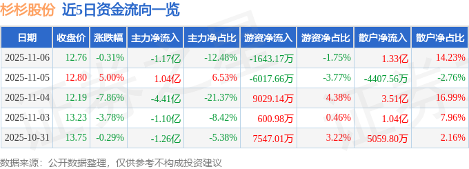 证券之星消息,截至2025年11月6日收盘,杉杉股份(600884)报收于12.76元,下跌0.31%,换手率4.07%,成交量73.53万手,成交额9.38亿元。