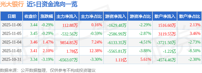 证券之星消息,截至2025年11月6日收盘,光大银行(601818)报收于3.44元,下跌0.29%,换手率0.44%,成交量206.18万手,成交额7.1亿元。