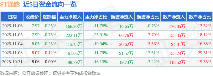 证券之星消息,截至2025年11月6日收盘,ST通脉(603559)报收于7.97元,下跌0.25%,换手率0.44%,成交量1.78万手,成交额1412.71万元。