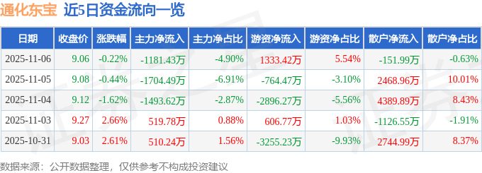 证券之星消息,截至2025年11月6日收盘,通化东宝(600867)报收于9.06元,下跌0.22%,换手率1.36%,成交量26.7万手,成交额2.41亿元。