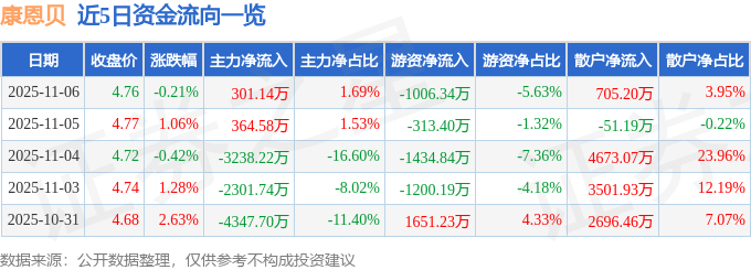证券之星消息,截至2025年11月6日收盘,康恩贝(600572)报收于4.76元,下跌0.21%,换手率1.49%,成交量37.43万手,成交额1.79亿元。
