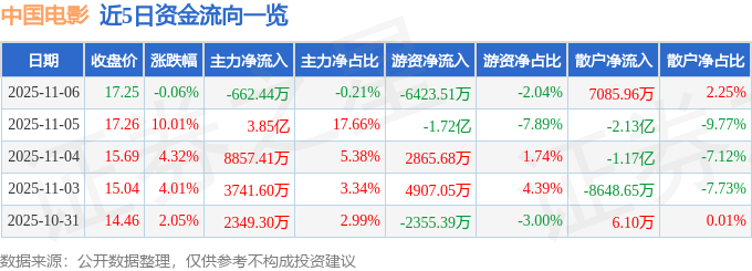 证券之星消息,截至2025年11月6日收盘,中国电影(600977)报收于17.25元,下跌0.06%,换手率9.52%,成交量177.71万手,成交额31.51亿元。