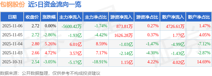 证券之星消息,截至2025年11月6日收盘,包钢股份(600010)报收于2.72元,上涨0.0%,换手率3.77%,成交量1183.17万手,成交额32.17亿元。
