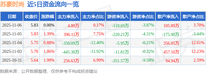 证券之星消息,截至2025年11月6日收盘,苏豪时尚(600287)报收于5.83元,上涨0.0%,换手率1.12%,成交量4.91万手,成交额2858.62万元。
