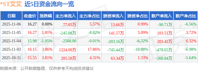 证券之星消息,截至2025年11月6日收盘,*ST艾艾(603580)报收于16.27元,上涨0.0%,换手率0.65%,成交量8550.0手,成交额1383.73万元。
