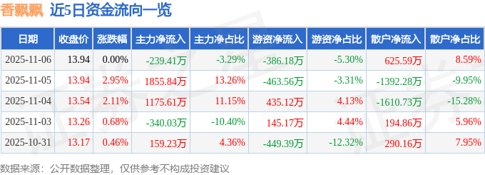 11月6日的资金流向数据方面,主力资金净流出239.41万元,占总成交额3.29%,游资资金净流出386.18万元,占总成交额5.3%,散户资金净流入625.59万元,占总成交额8.59%。