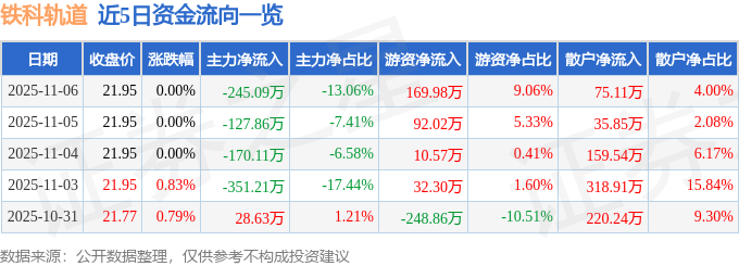 证券之星消息,截至2025年11月6日收盘,铁科轨道(688569)报收于21.95元,上涨0.0%,换手率0.41%,成交量8538.0手,成交额1876.62万元。