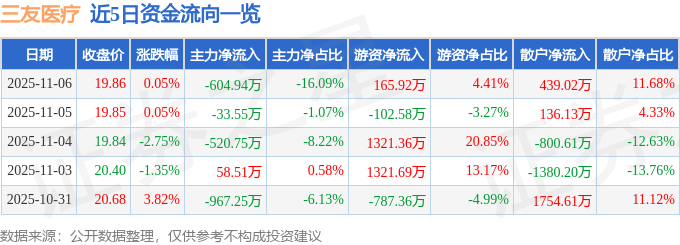 证券之星消息,截至2025年11月6日收盘,三友医疗(688085)报收于19.86元,上涨0.05%,换手率0.61%,成交量1.9万手,成交额3760.31万元。