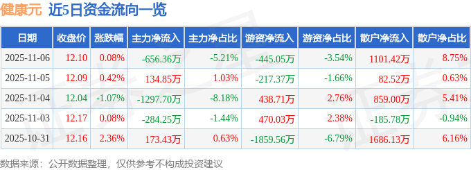 11月6日的资金流向数据方面,主力资金净流出656.36万元,占总成交额5.21%,游资资金净流出445.05万元,占总成交额3.54%,散户资金净流入1101.42万元,占总成交额8.75%。