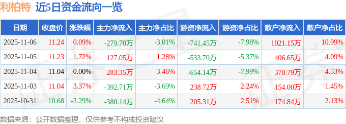 11月6日的资金流向数据方面,主力资金净流出279.7万元,占总成交额3.01%,游资资金净流出741.45万元,占总成交额7.98%,散户资金净流入1021.15万元,占总成交额10.99%。