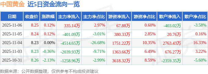 证券之星消息,截至2025年11月6日收盘,中国黄金(600916)报收于8.25元,上涨0.12%,换手率0.81%,成交量13.67万手,成交额1.13亿元。