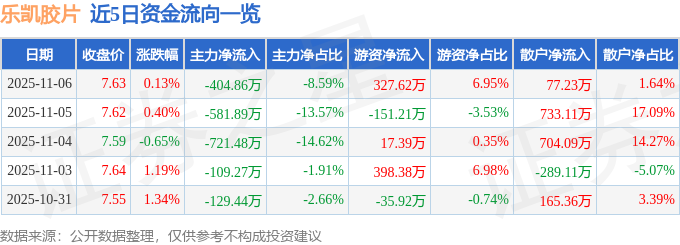 11月6日的资金流向数据方面,主力资金净流出404.86万元,占总成交额8.59%,游资资金净流入327.62万元,占总成交额6.95%,散户资金净流入77.23万元,占总成交额1.64%。