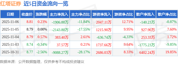 证券之星消息,截至2025年11月6日收盘,红塔证券(601236)报收于8.81元,上涨0.23%,换手率0.39%,成交量18.28万手,成交额1.61亿元。