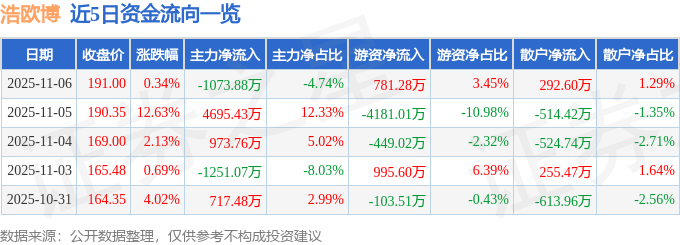 证券之星消息,截至2025年11月6日收盘,浩欧博(688656)报收于191.0元,上涨0.34%,换手率1.86%,成交量1.18万手,成交额2.27亿元。