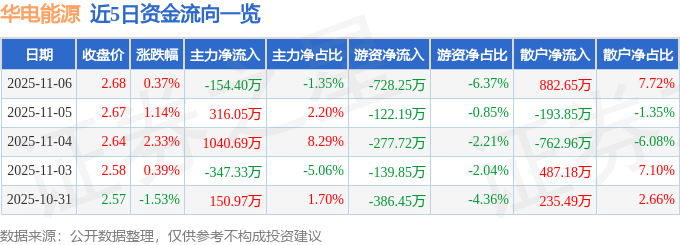 证券之星消息,截至2025年11月6日收盘,华电能源(600726)报收于2.68元,上涨0.37%,换手率1.55%,成交量42.56万手,成交额1.14亿元。