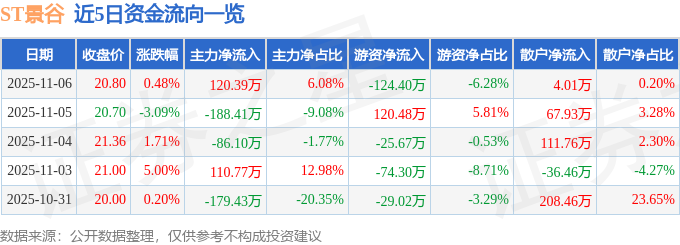 证券之星消息,截至2025年11月6日收盘,ST景谷(600265)报收于20.8元,上涨0.48%,换手率0.75%,成交量9716.0手,成交额1981.08万元。