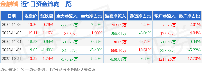 11月6日的资金流向数据方面,主力资金净流出279.45万元,占总成交额7.4%,游资资金净流入203.69万元,占总成交额5.4%,散户资金净流入75.76万元,占总成交额2.01%。