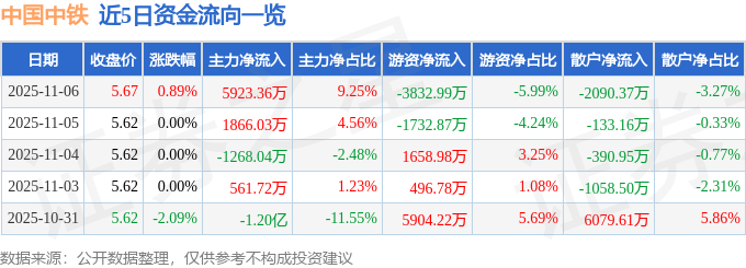 证券之星消息,截至2025年11月6日收盘,中国中铁(601390)报收于5.67元,上涨0.89%,换手率0.55%,成交量112.71万手,成交额6.4亿元。