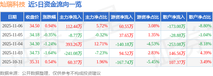证券之星消息,截至2025年11月6日收盘,灿瑞科技(688061)报收于34.5元,上涨0.94%,换手率1.27%,成交量5705.0手,成交额1964.8万元。