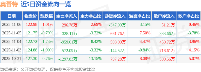 证券之星消息,截至2025年11月6日收盘,奥普特(688686)报收于122.98元,上涨1.01%,换手率0.74%,成交量9038.0手,成交额1.11亿元。