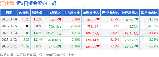 证券之星消息,截至2025年11月6日收盘,江化微(603078)报收于18.25元,上涨1.22%,换手率1.99%,成交量7.66万手,成交额1.39亿元。