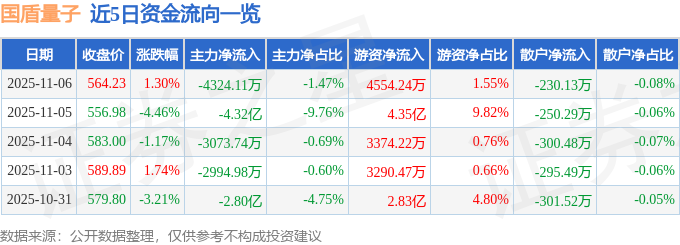 证券之星消息,截至2025年11月6日收盘,国盾量子(688027)报收于564.23元,上涨1.3%,换手率6.51%,成交量5.23万手,成交额29.35亿元。