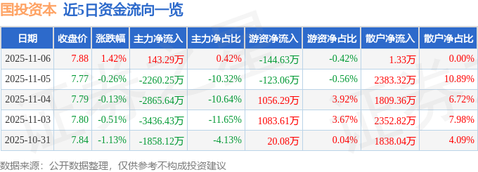 证券之星消息,截至2025年11月6日收盘,国投资本(600061)报收于7.88元,上涨1.42%,换手率0.68%,成交量43.66万手,成交额3.43亿元。