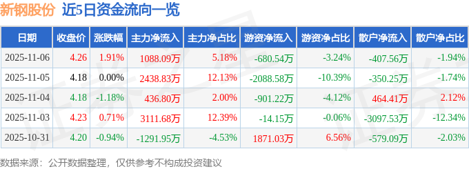 证券之星消息,截至2025年11月6日收盘,新钢股份(600782)报收于4.26元,上涨1.91%,换手率1.58%,成交量49.73万手,成交额2.1亿元。