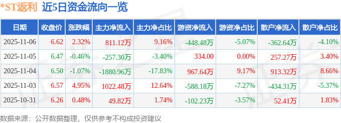 证券之星消息,截至2025年11月6日收盘,*ST返利(600228)报收于6.62元,上涨2.32%,换手率3.22%,成交量13.39万手,成交额8854.32万元。